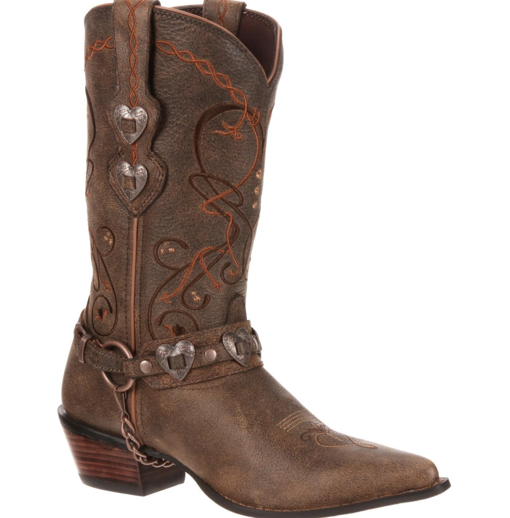 These boots aren't made just for walking. Whether you're hanging out with friends or planning on dancing the night away with your favorite cowboy, these fashionable, quality-made Crush by Durango boots are a fabulous option. The great thing about wearing Durango Boots, is that they make a fashion statement that all of your friends will be envious of. These boots have an authentic pointed toe, with a 1 7/8" cowgirl heel. The upper is made from supple, antiqued full grain-leather and features a soft mesh lining to keep your legs comfortable. These 11" Heartbreaker boots have rich-looking details; like the removable heart concho harness strap that has antique copper hardware. Also, there are matching heart shaped conchos that are mounted underneath the leather pull tabs to create a versatile look. With such detail, you can wear the #4155 boots from day to night, and with a variety of outfits. Other great features of the Heartbreaker boot are the bark-textured rubber outsole, stained heel, and spur ledge. A tempered steel shank lends support for comfortable riding or dancing. The Crush by Durango boots are a great pair to pull on and get some attitude.
