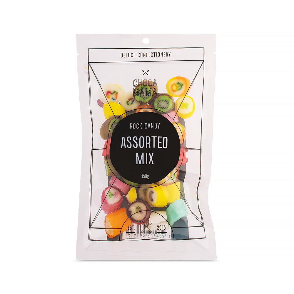 Hand made assorted fruit rock candy in a resealable travel bag. Australian made.